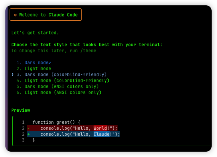 정상적으로 실행됐다면 터미널에서 사용할 테마를 골라준다. 본인은 Dark Mode (colorblind-friendly)로 골랐음.