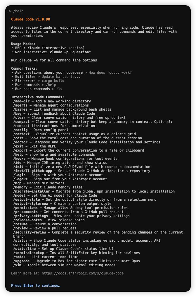 또한 Claude Code의 커맨드를 확인하고 싶다면 여느 라이브러리들과 마찬가지로 아래 명령어를 통해 확인할 수 있다.