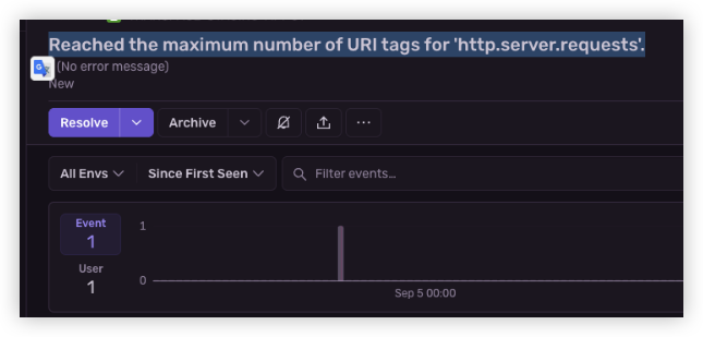 http.server.requests 에러는 메트릭 시스템에서 URI 태그의 고유한 조합이 너무 많아질 경우 발생하는 에러다.