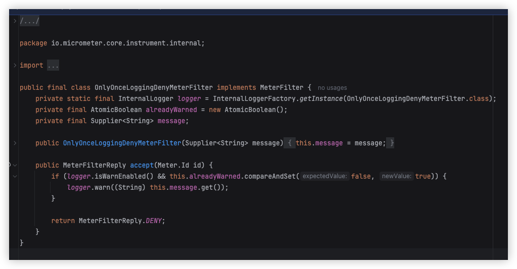 warning 로그가 발생하고 있는 지점은 micrometer-core의 OnlyOnceLoggingDenyMeterFilter였다.
